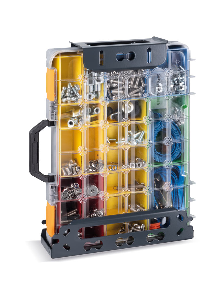 The steel drill-bit holder can be used to organise drill bits and cutters so you can have them on hand at all times. It can be fastened to the perforated panel or inserted in the reversible shelf.