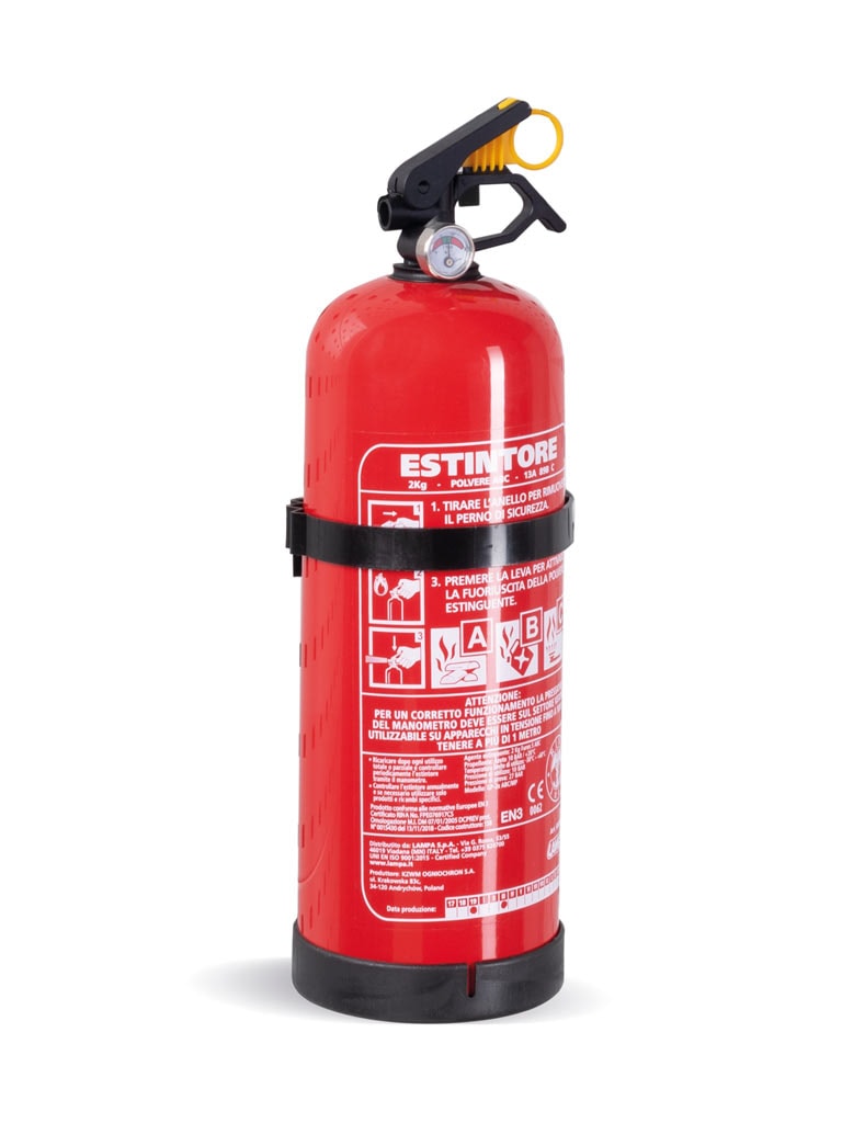 The fire extinguisher holder consists of a support with a round base and a strap to secure the canister safely.